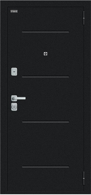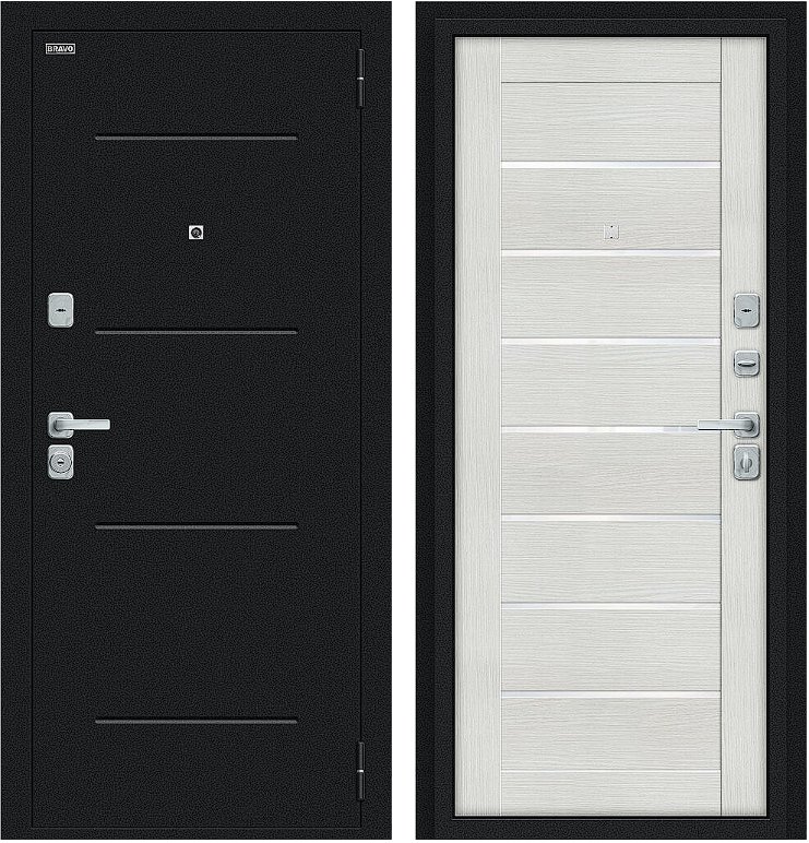 Надежная входная Дверь Браво Техно/BChrome Букле черное/Bianco Melinga премиум класса по цене 33 903 руб. Большая толщина стали защитит от проникновения в ваш дом, квартиру или коттедж. Используется очень качественная фурнитура: замки, цилиндры, ручки, защелки. Покрытие и отделка двери изготовлено под внимательным контролем производителя. Дверь имеет долгий срок службы и гарантию.