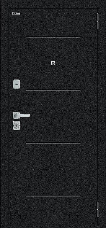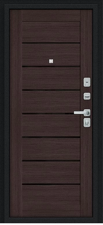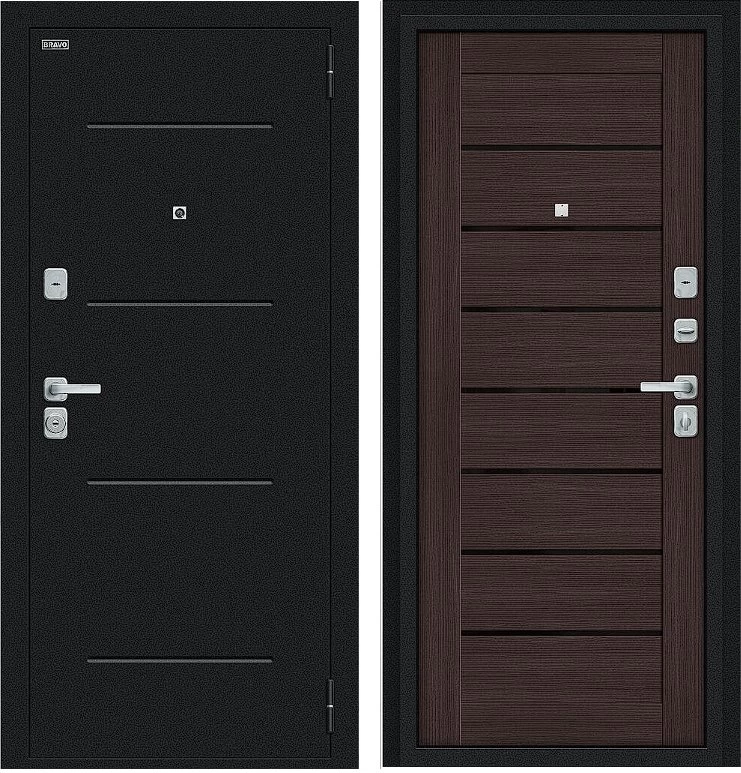 Надежная входная Дверь Браво Техно/BChrome Букле черное/Wenge Melinga премиум класса по цене 33 903 руб. Большая толщина стали защитит от проникновения в ваш дом, квартиру или коттедж. Используется очень качественная фурнитура: замки, цилиндры, ручки, защелки. Покрытие и отделка двери изготовлено под внимательным контролем производителя. Дверь имеет долгий срок службы и гарантию.